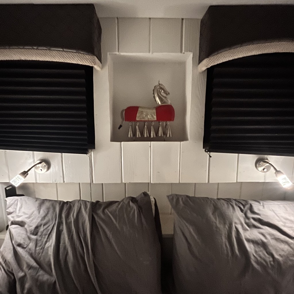 Fits perfectly in the mantle above the bed, at the very back of the bus. A great copilot at my 6, jingling behind me to let me know things are still cool when I go over a big bump. And when things get too bumpy, dude just tumbles harmlessly onto the bed. Good horse4.